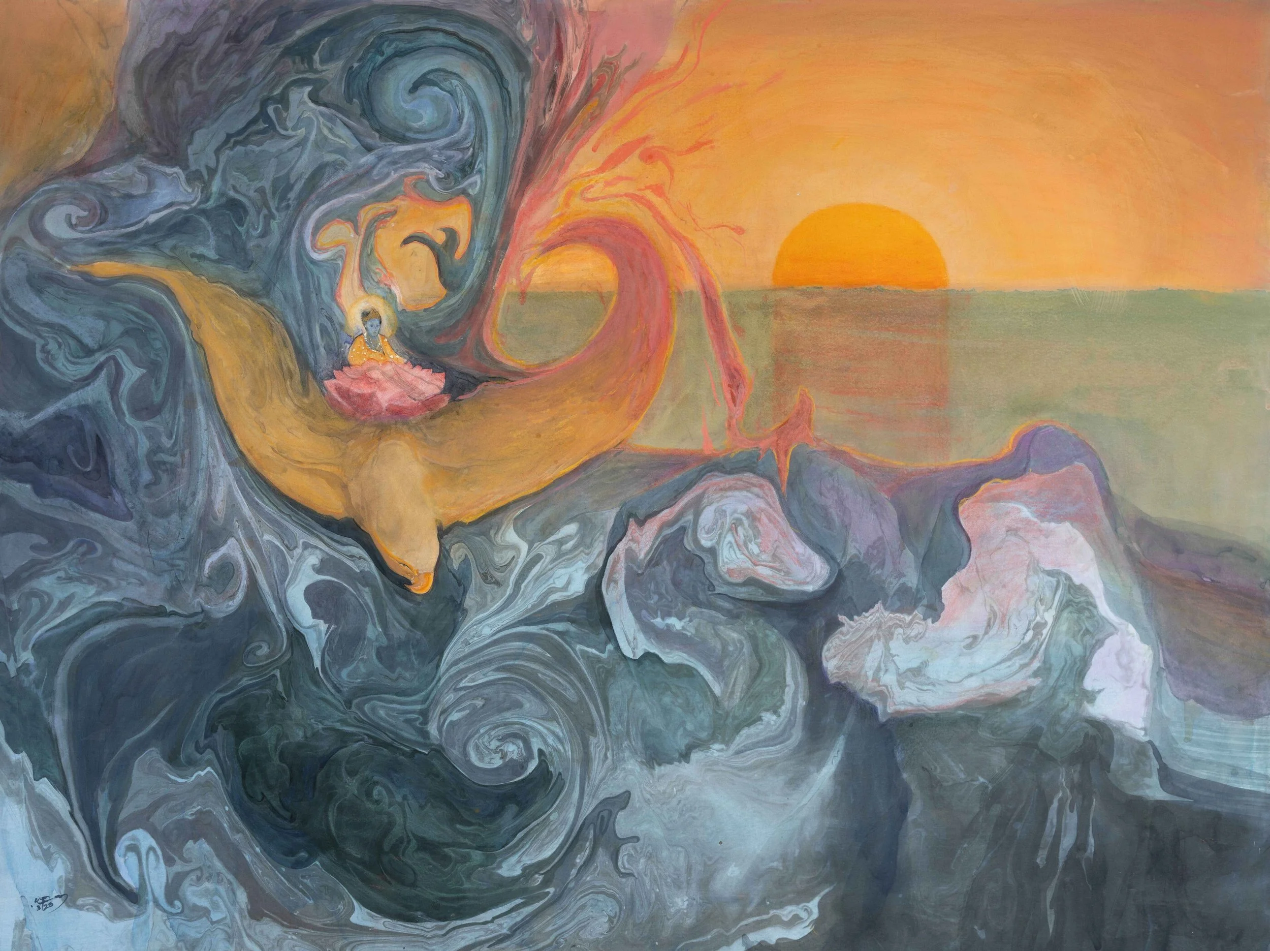 Garuda draws on Hindu cosmology, where Vishnu, the sustainer, journeys across the ocean of existence upon his divine vehicle, Garuda. Water, a recurring element in the work, suggests flow, transformation, and the vastness of being.
